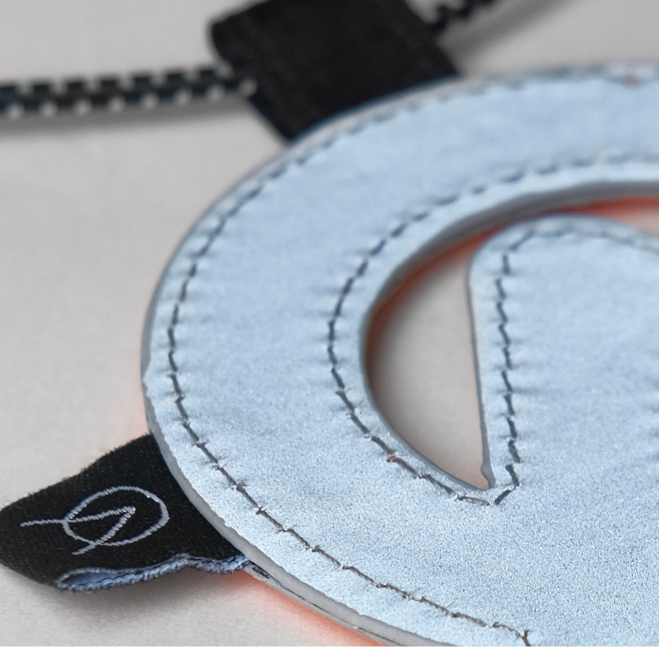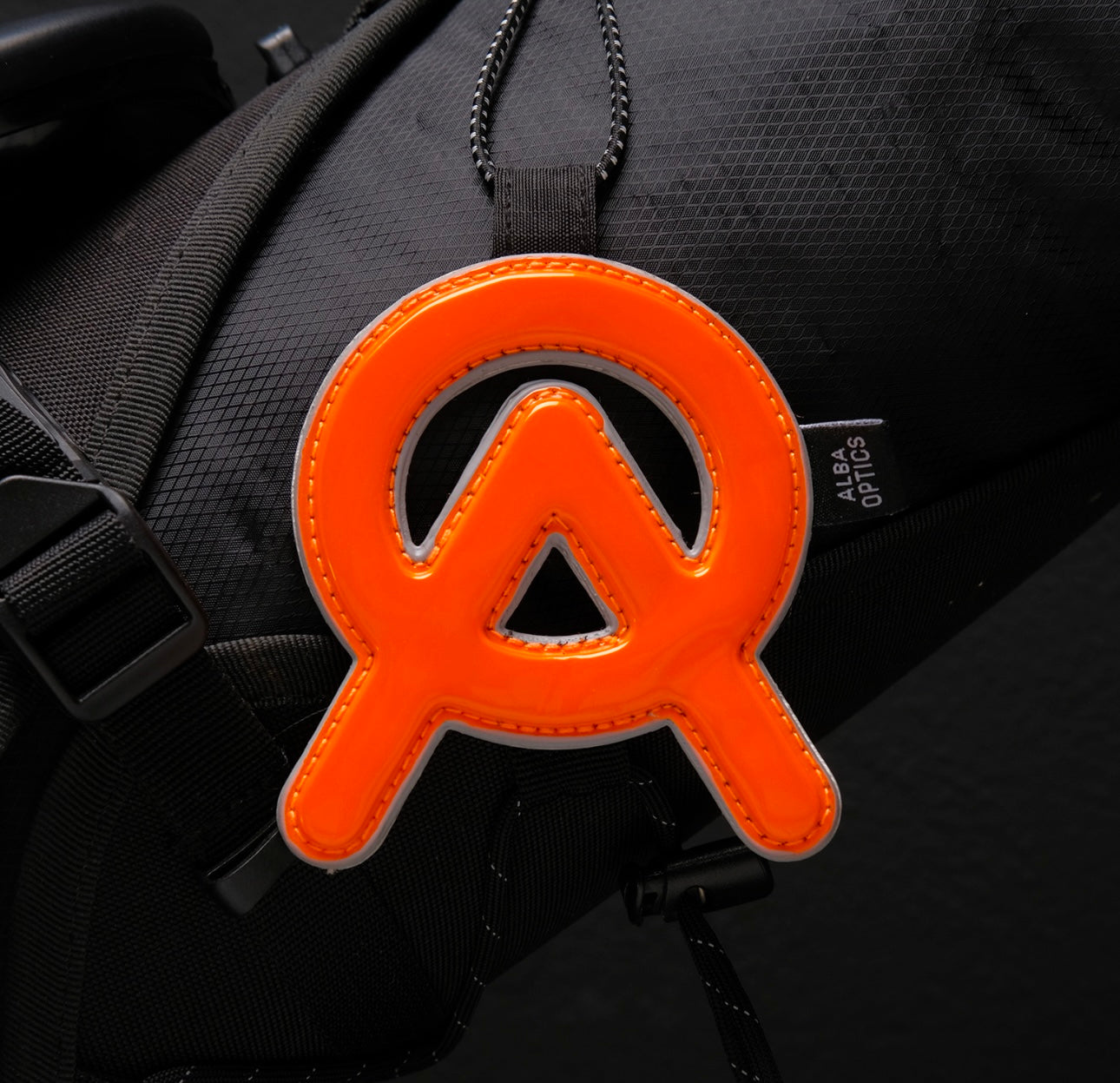 Ride safe with our LOGO REFLECTOR. Ideal for making visible during your adventures. The elastic black leash is easy to close around rings or cords of your bags. The front side is orange bumped reflective and the back silver.