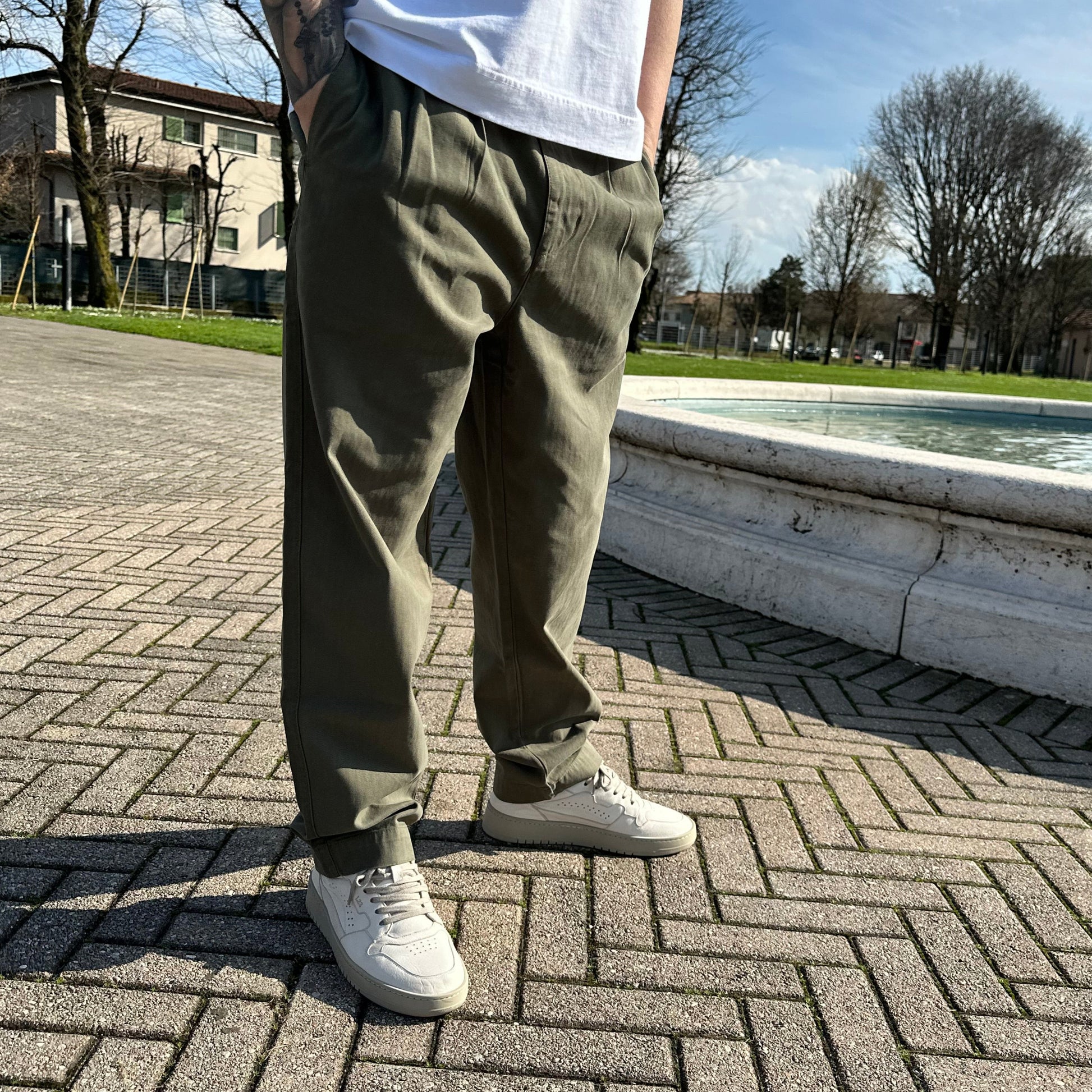Casual pants in herringbone cotton canvas, with a loose fit and a slightly tapered leg at the ankle.