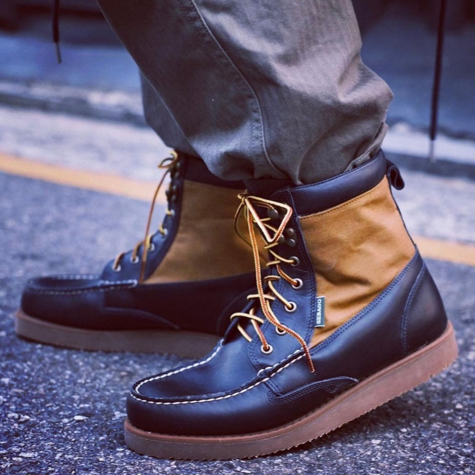 This sturdy ankle boot transports the classic look and moc cut into the coldest season, giving the foot a warmer and more opaque upper and special rubber soles to move with ease in unfavorable weather conditions. Hand-stitched with the finest craftsmanship, this loafer is crafted from heat-tanned leather treated with a rich combination of oils and waxes, and features classic English Millera canvas cuff, moc-toe upper, reinforced mountain laces and a designed sole to provide comfort and shock absorption. Hot embossed logo on the side. The "Rogdens" take their name from a historic Sebago shoe model and are perfect to wear in camp when the season gets colder.