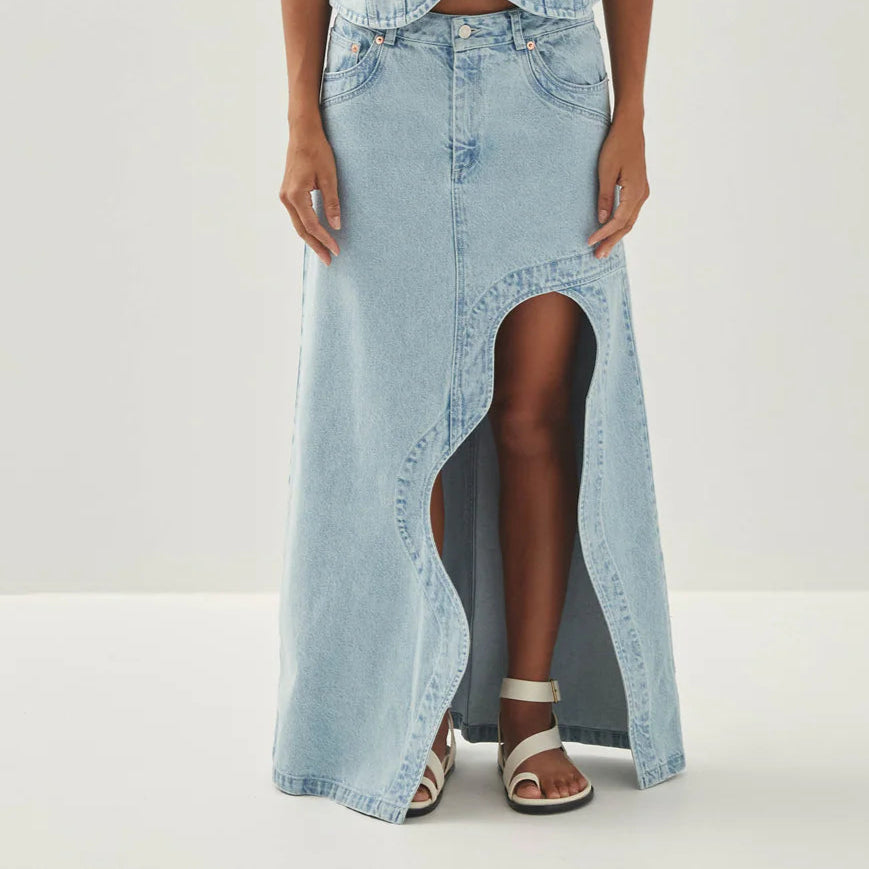 The Carmina is a light blue denim maxi skirt featuring a unique front cut-out design. Its rounded shapes create an eye-catching detail that subtly reveals the leg, adding character to the structured silhouette.
