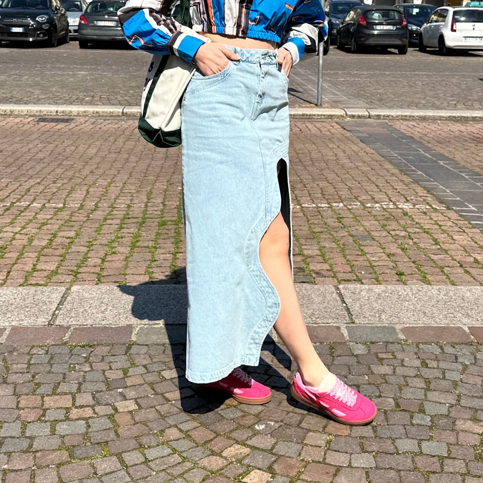 Light blue denim skirt with a front cut-out