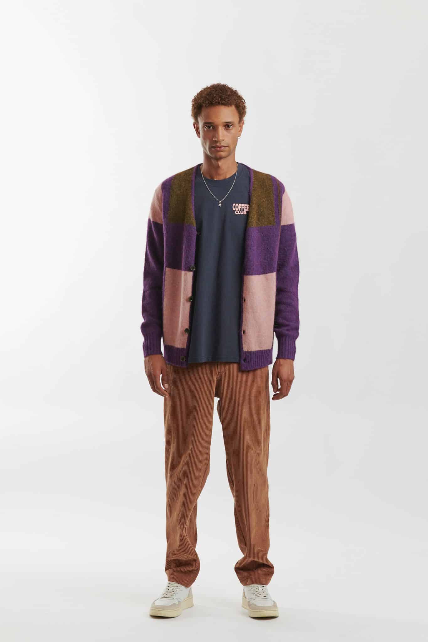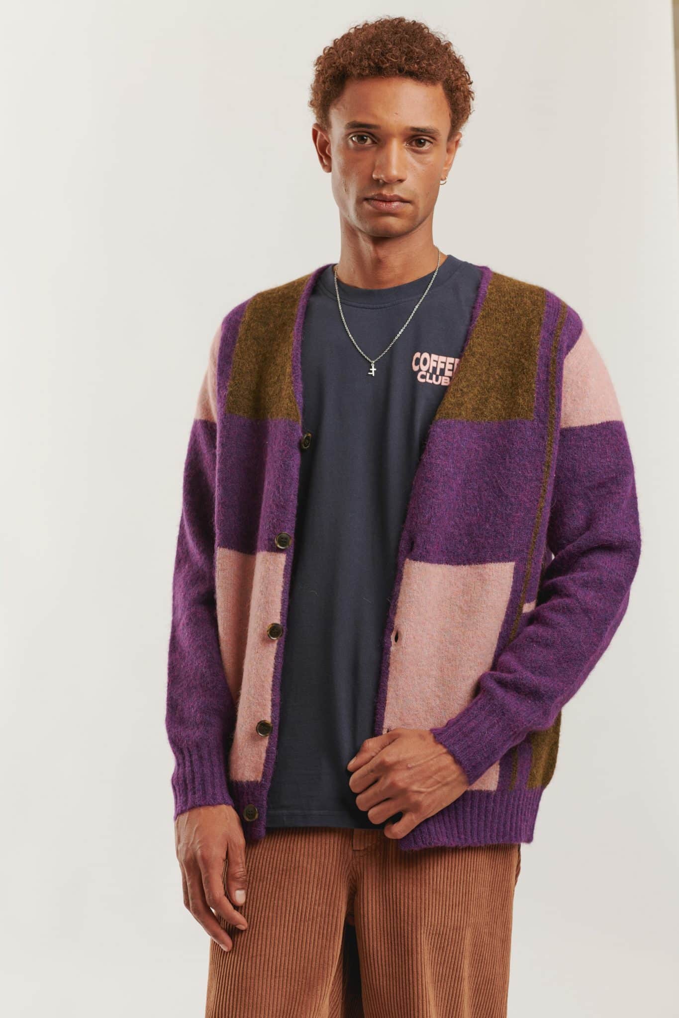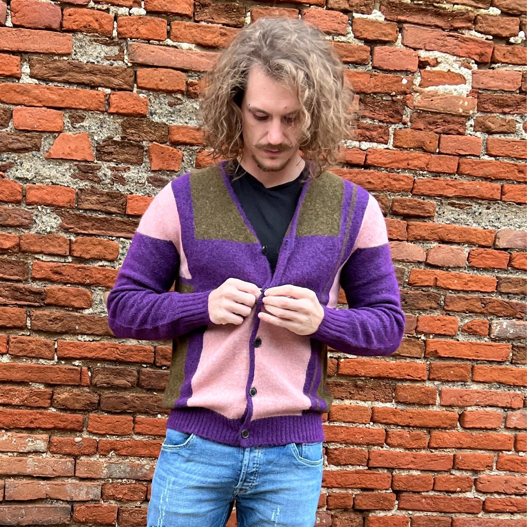 ウール&アルパカ混紡のカーディガンニットです。モダニズム的なラインとパッチで構成された絵画からインスピレーションを得ています。この職人技の作品は、フロントのボタンダウンとリブ編みの袖口と裾が特徴です。