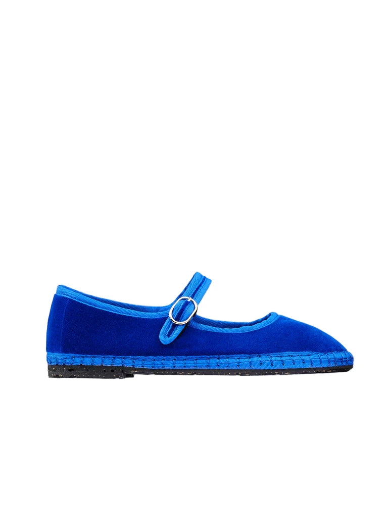 - Velvet mary jane in blue with blue piping and buckle closure.