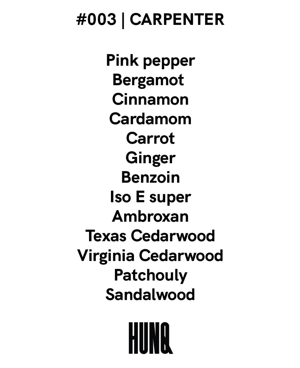 ベースノート: ベンゾイン、ISO E スーパー、アンブロキサン、テキサス シダーウッド、バージニア シダーウッド、パチョリー、サンダルウッド