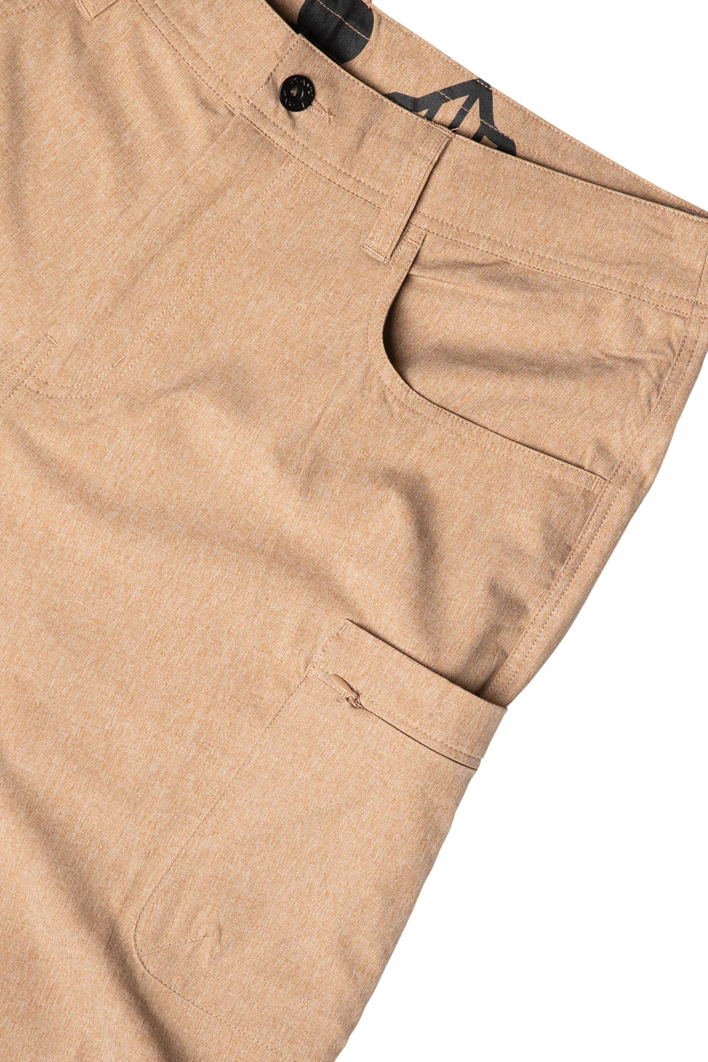 レギュラーフィット、ロゴシャンクボタンとジップフライを備えた固定ウエストハイブリッドショーツ、スクリーンプリントとロゴプリントアグレットを備えた内部ウエストバンドとドローコードシステム、背面中央ロッカーループ付きベルトループ、右コインジップポケット付き補強フロントポケット、ベルクロ付きバックウェルトポケット開閉部と内部の弾性コードキーループ、裾がピースされたサイドカーゴポケット、着用者の右側に内側のセキュリティメッシュジップポケット、メッシュポケットバッグ、2本針で補強された縫い目。