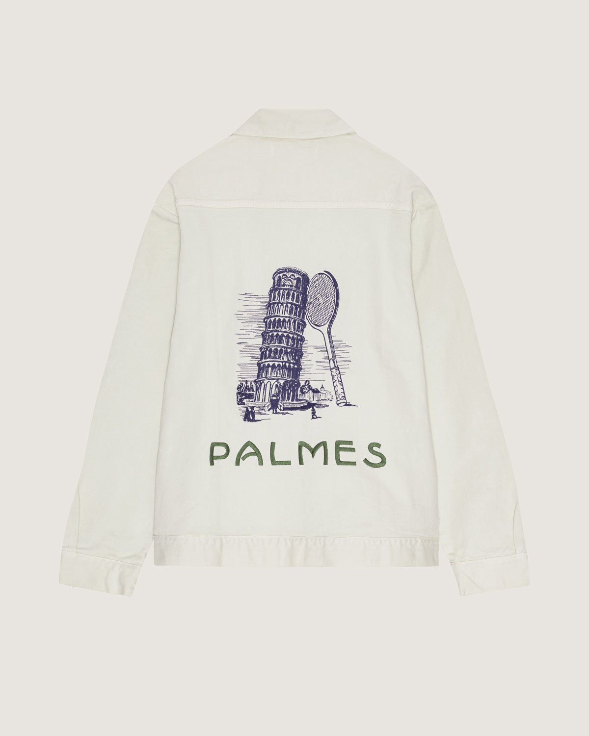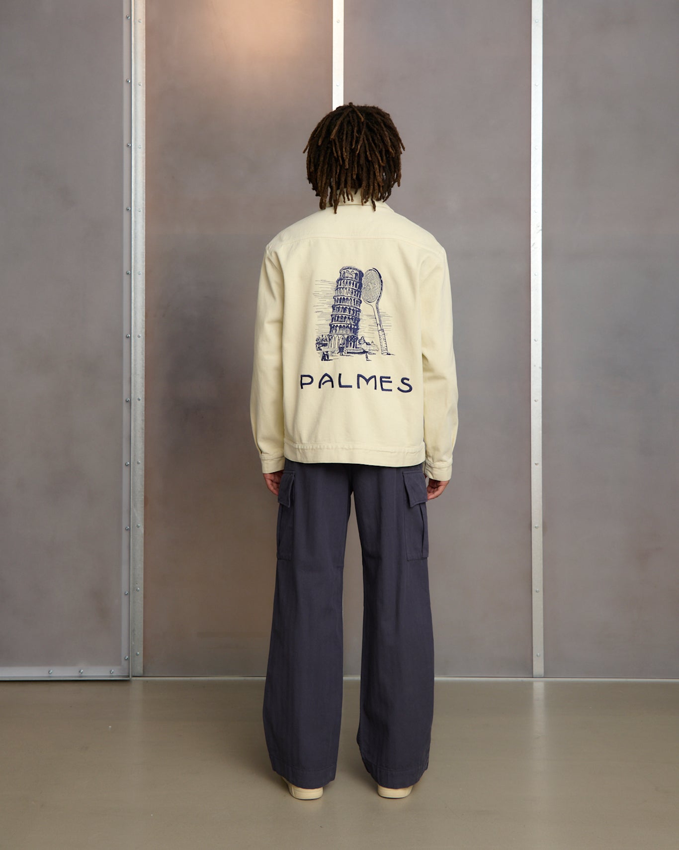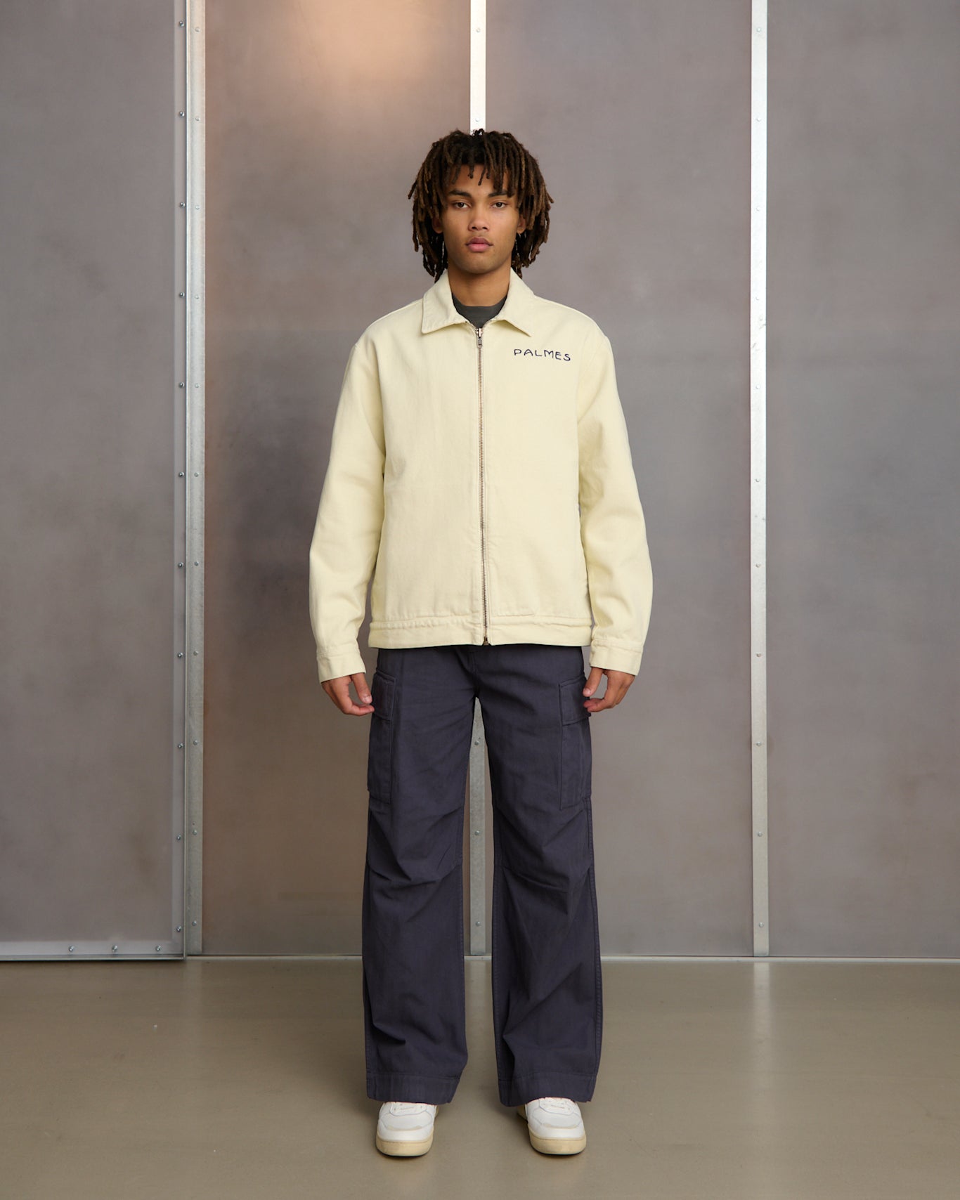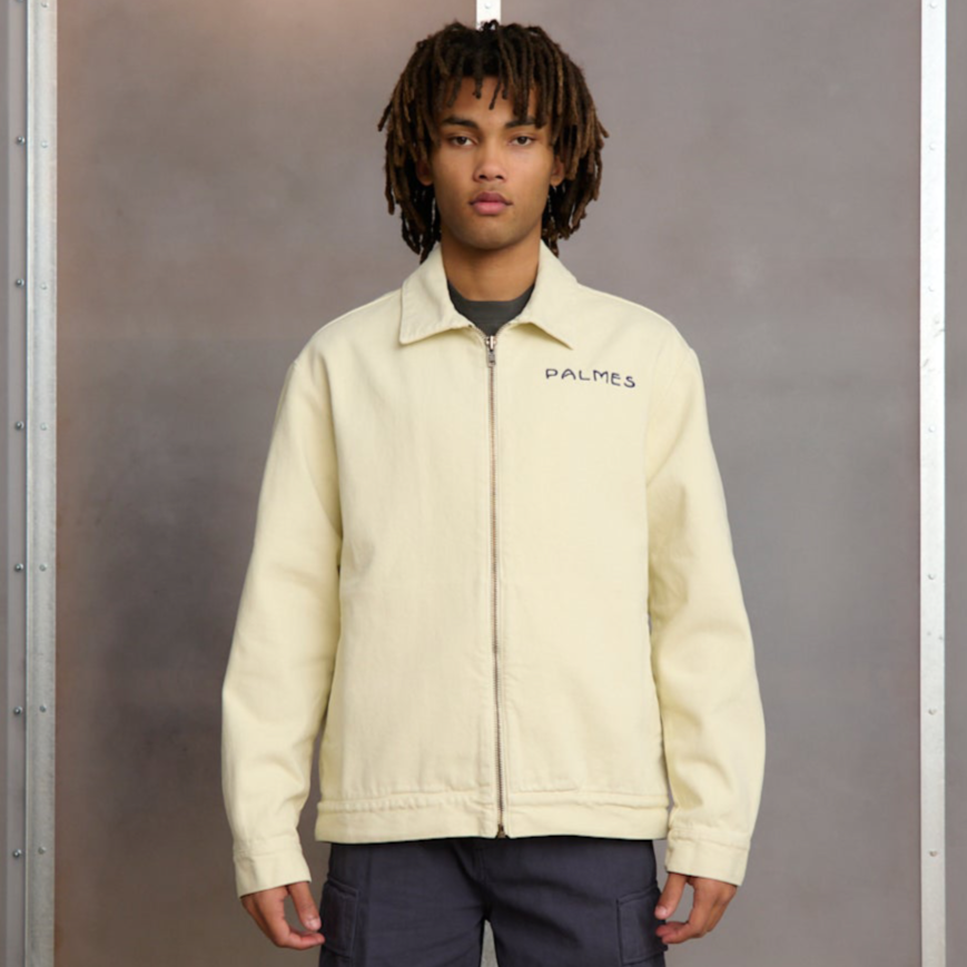 Our zip jacket with a seasonal artwork, inspired by the Memory Of A Journey painting by Belgian surrealist, Rene Magritté. Cut from a crisp, organic cotton twill that has been given a wash for a broken-in look. Comes with a sturdy YKK zipper on front. Features embroidery on left chest and back.