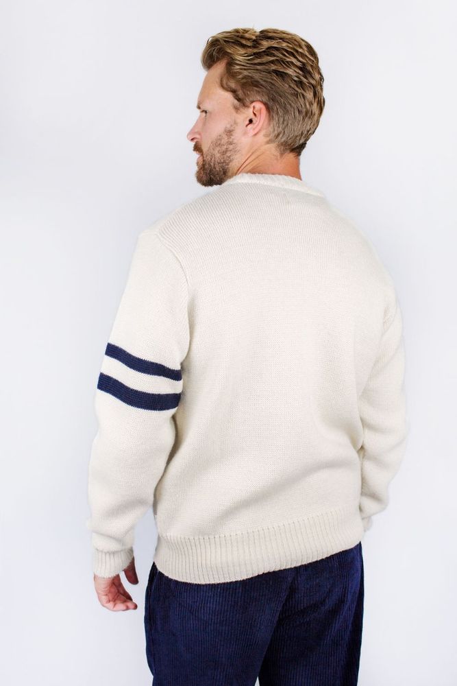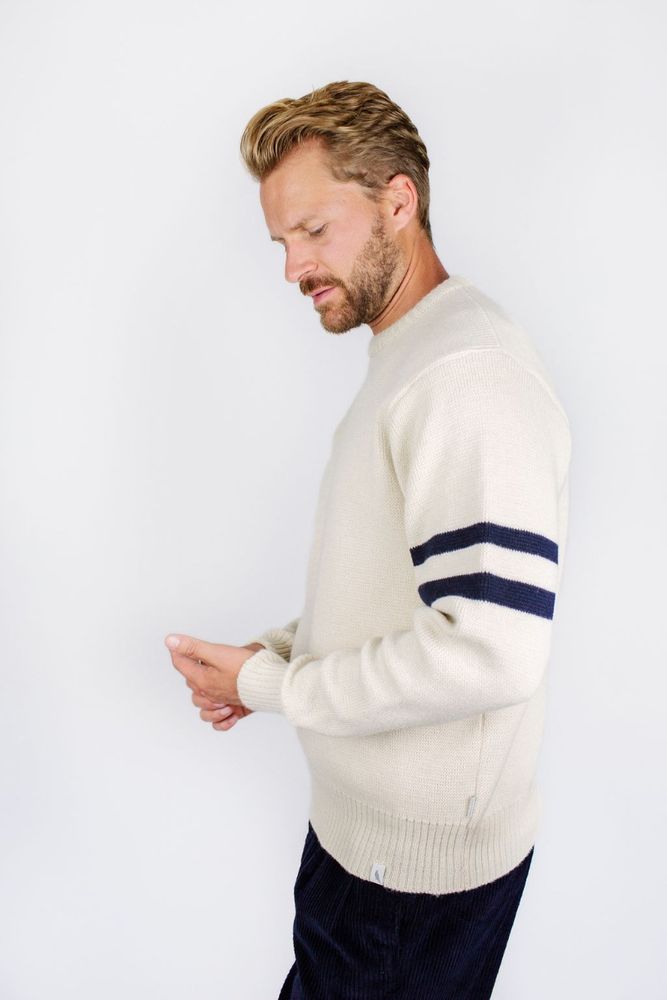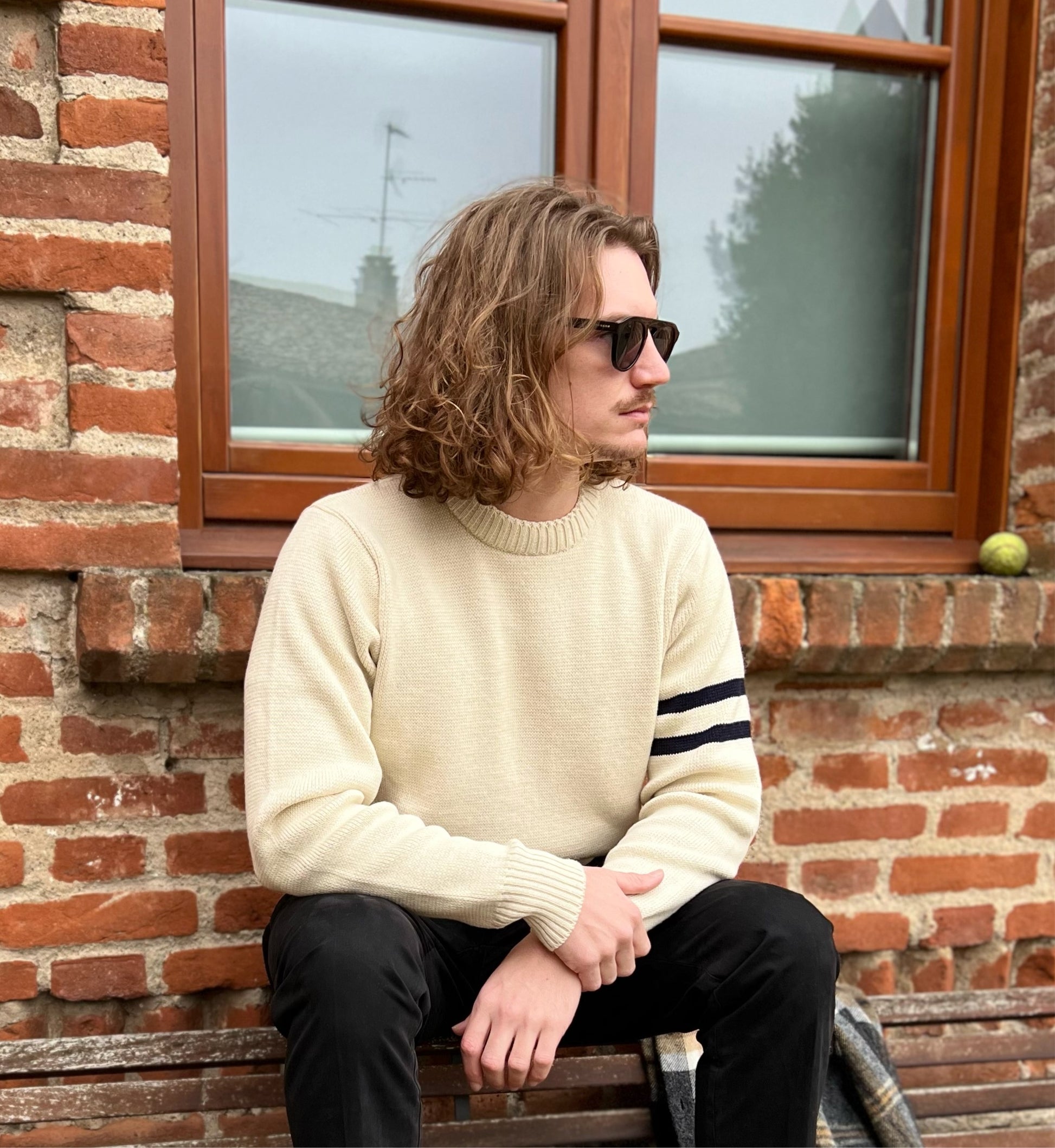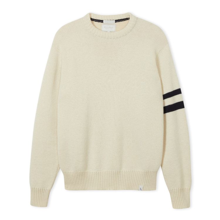 伝統的な英国の航海用ニットウェアに敬意を表した Moore Crew は、2 つのクラシックなカラーウェイでご利用いただけます。それぞれ左腕に2本の対照的なストライプが入っています。