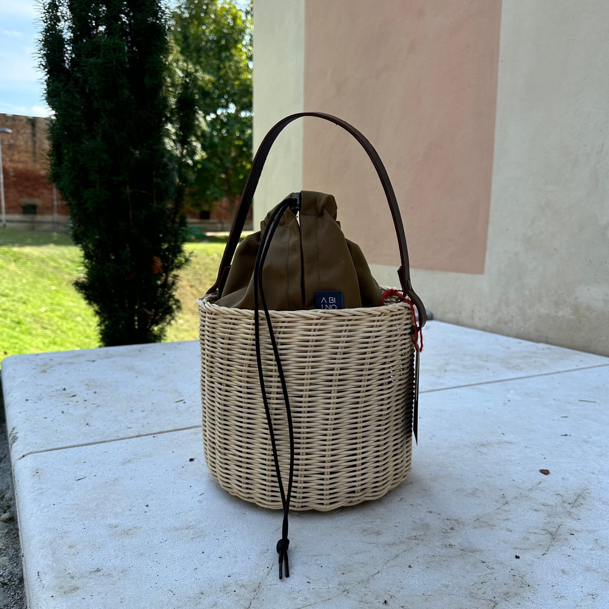 Woven wicker bucket, with removable inner bag in waxed canvas; drawstring closure. Handle and detachable shoulder strap in vegetable tanned leather.