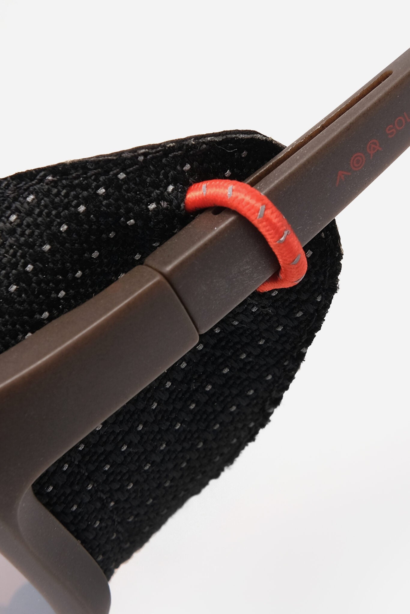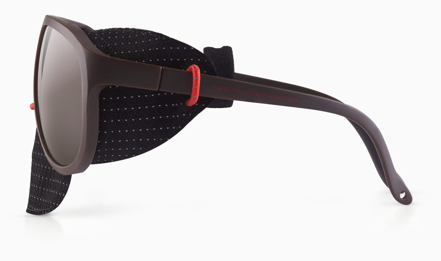 Thin and fresh, the mountain air nips at your damp brow. Lungs heave with every step, inhale, exhale. The dolostone you pass, old friends, welcome you home. 8,000 feet above sea level and climbing, there is no going back. This is the way. Dedicated to alpine enthusiasts, the Solo Ultra was developed for efficiency, offering a series of unique details specific to alpine activities: removable fabric side shields and nose flap, made from premium quality reflective nylon material, for eye and skin protection. Ergonomic temple tips with a soft rubber grip for comfort. A narrow channel in the temple tip accommodates a removable velcro strap, securing climbing tools such as a small torch to the frame.