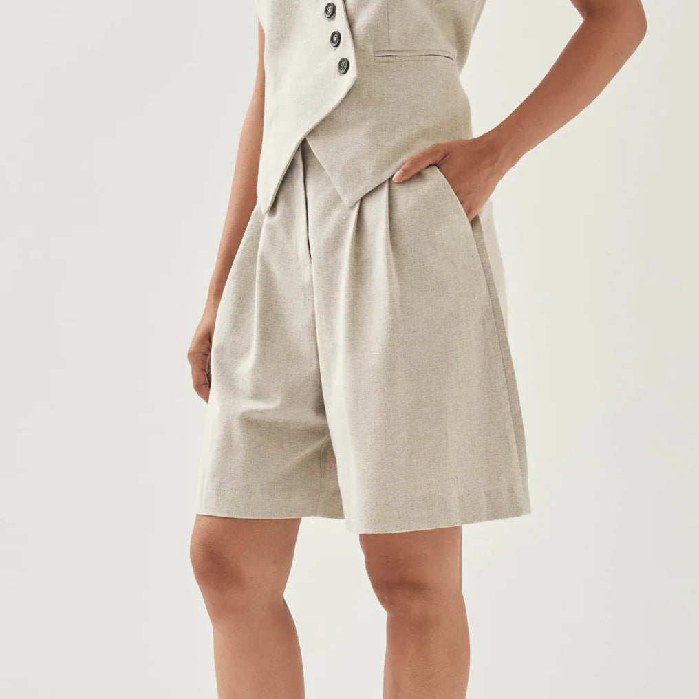 The Niselle bermuda shorts sit high on the waist and feature wide-leg, an invisible hook-and-eye fastener, and a decorative side button. Crafted from 100% organic cream cotton, this piece is a perfect match when paired with the Totti vest.
