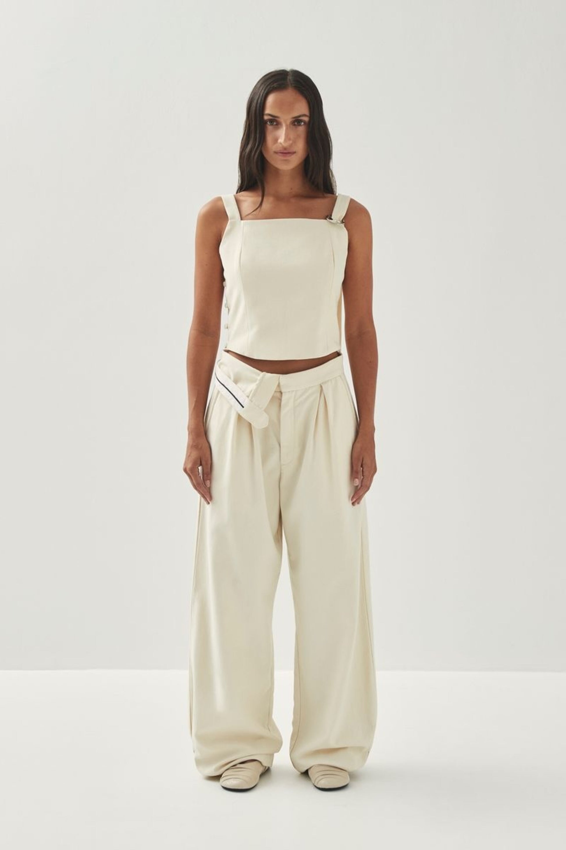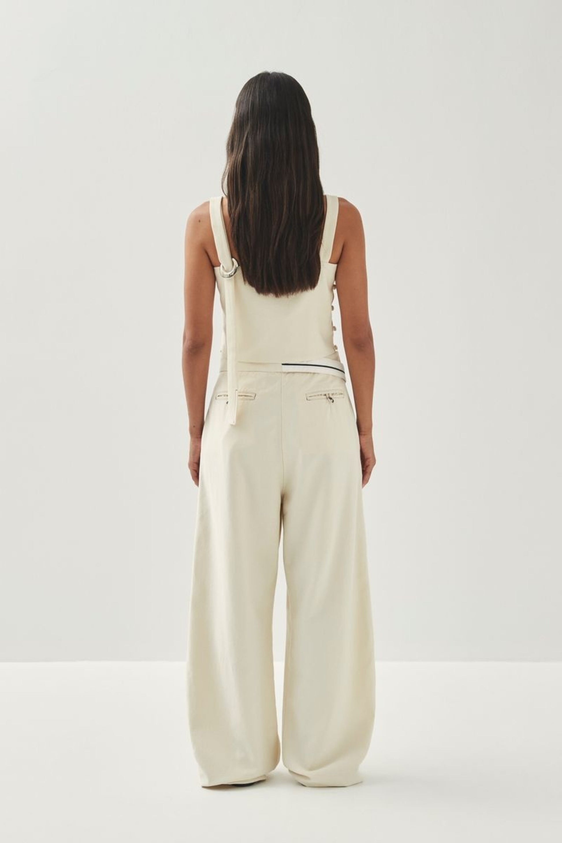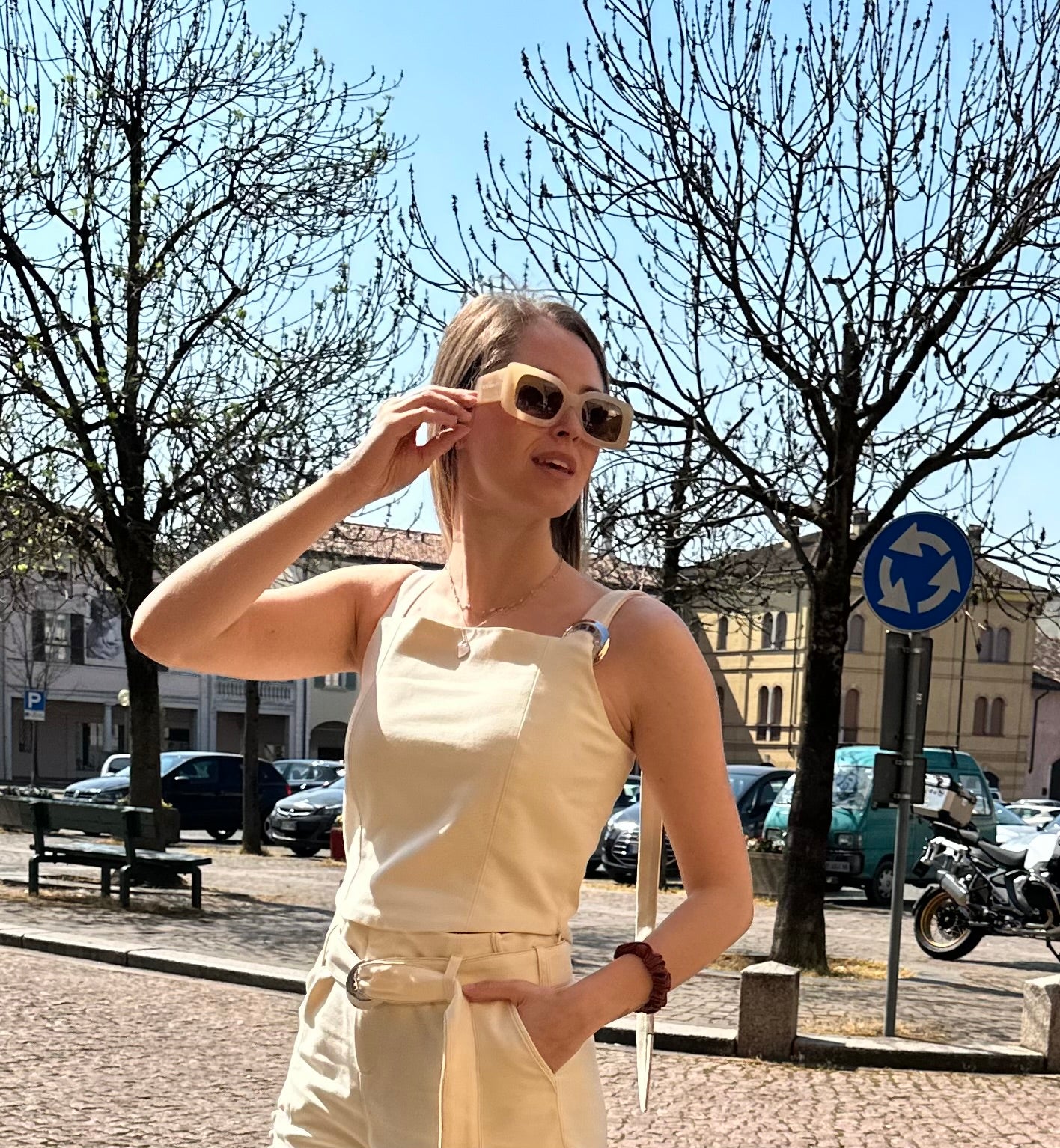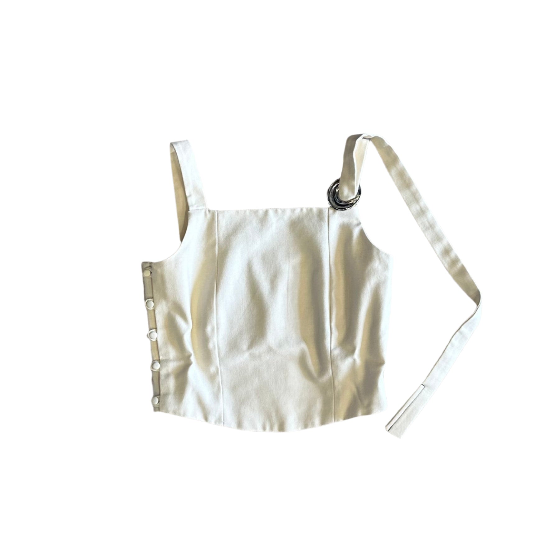 Made from natural linen, the Keila top features a cropped silhouette with a square neckline and wide straps. The left one is adorned with a decorative silver ring at the back, from which hangs a long strap.