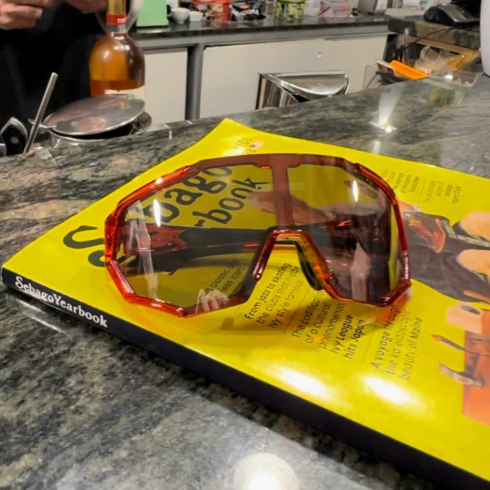Technical cycling glasses in Swiss tr90 grilamid material weighing 27 gr with cylindrical flash lens in polycarbonate, weight 27 gr.