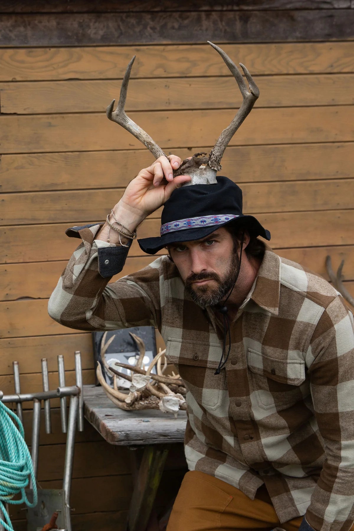 Organic cotton canvas bucket hat, adjustable chinstrap with cord lock, floppy brim, patterned nylon tubular webbing, interior moisture absorbing sweatband.