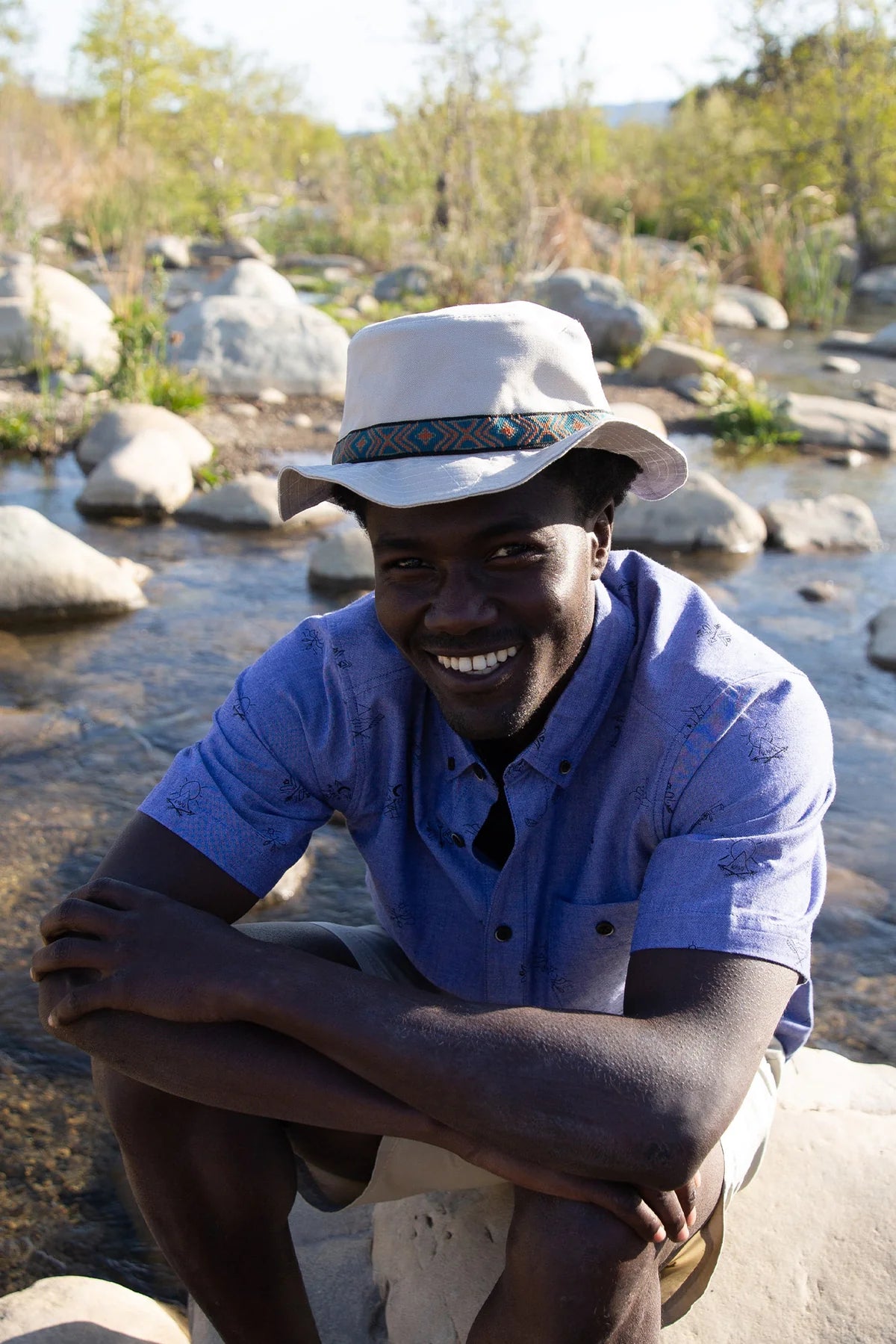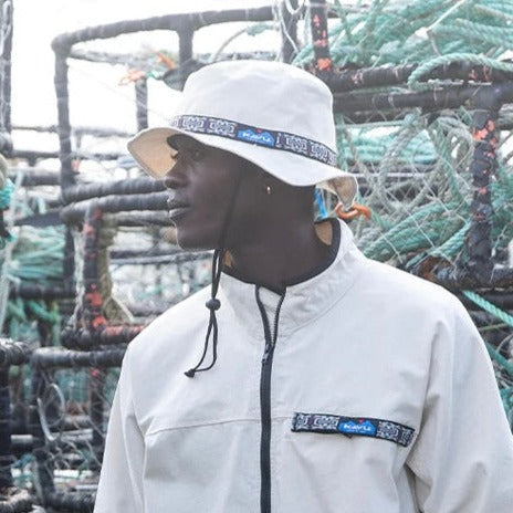 Organic cotton canvas bucket hat, adjustable chinstrap with cord lock, floppy brim, patterned nylon tubular webbing, interior moisture absorbing sweatband.