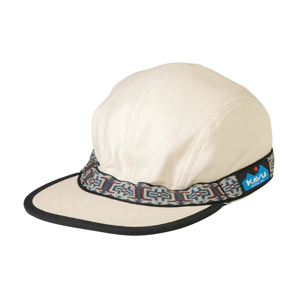 4 panel cap, slight curved bill, black underbill, patterned nylon tubular webbing with KAVU adjustment.