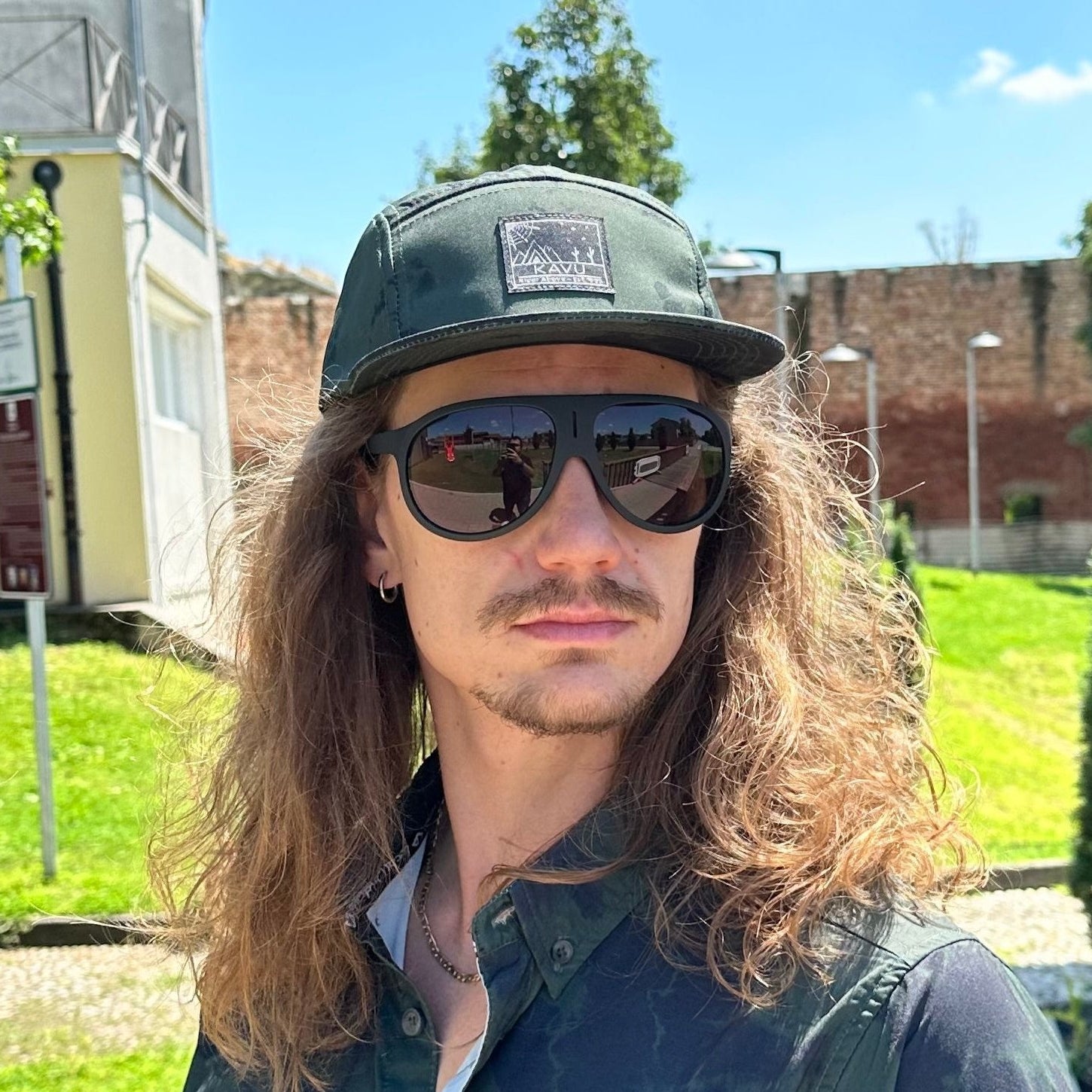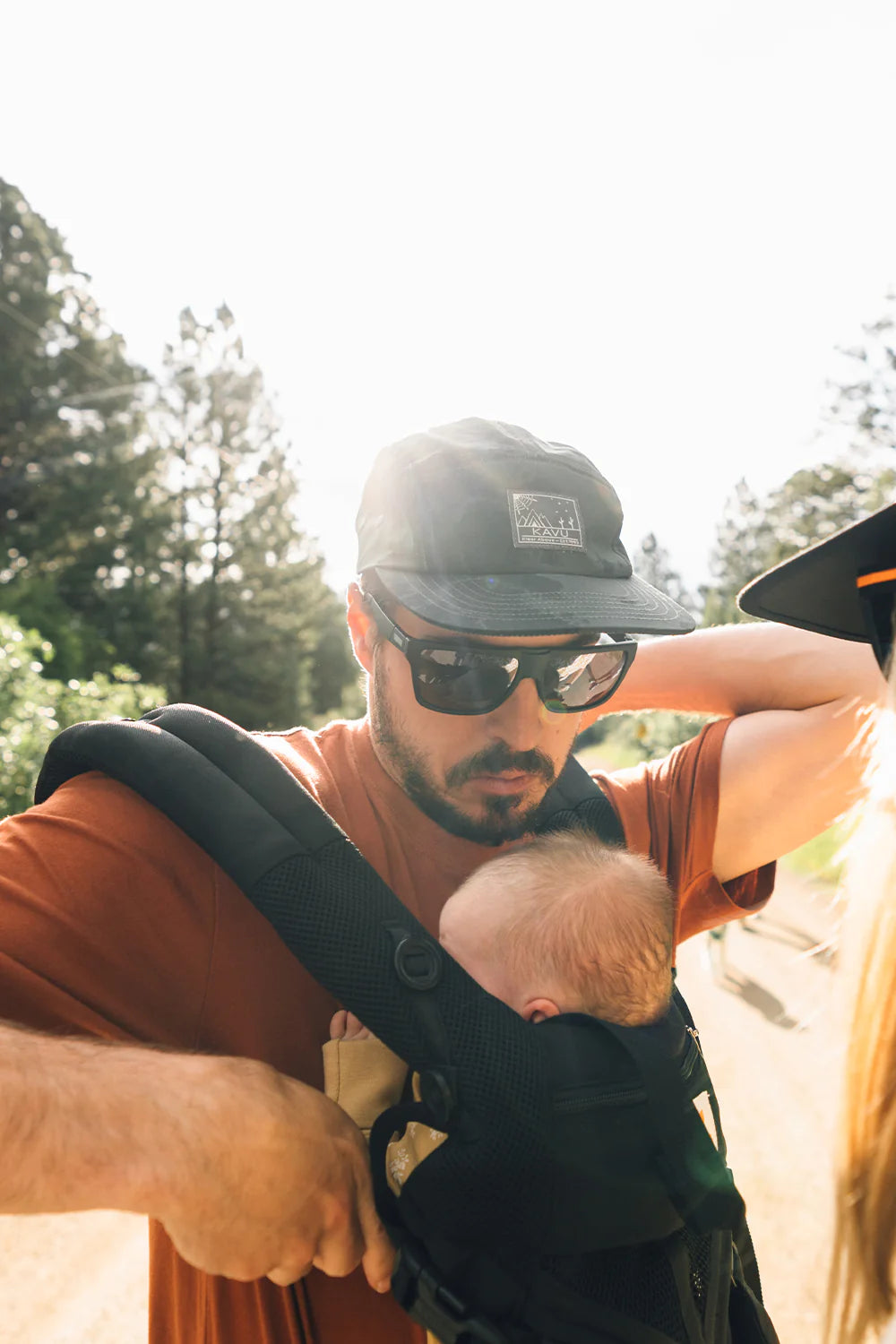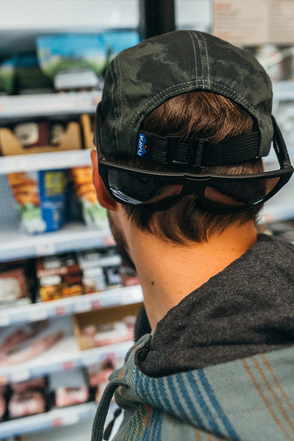 5 panel camp cap, logo label on front, embroidered eyelets, flat bill, back clip buckle and adjustable strap closure, interior taping and moisture absorbing sweatband.