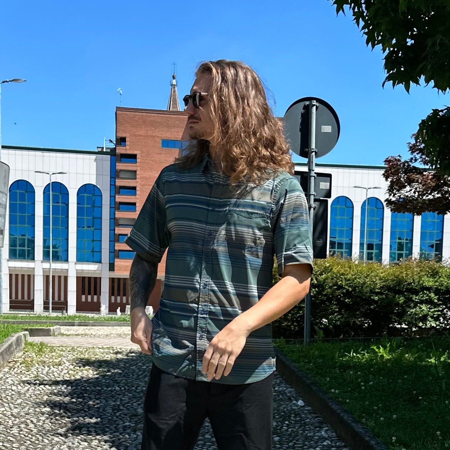 Casual fit, short sleeve button up shirt, stand collar, single chest pocket, 25% certified recycled polyester pearlized buttons with satin finish, logo snap at hidden pocket at bottom hem, back yoke panel with center box pleat, curved hem.