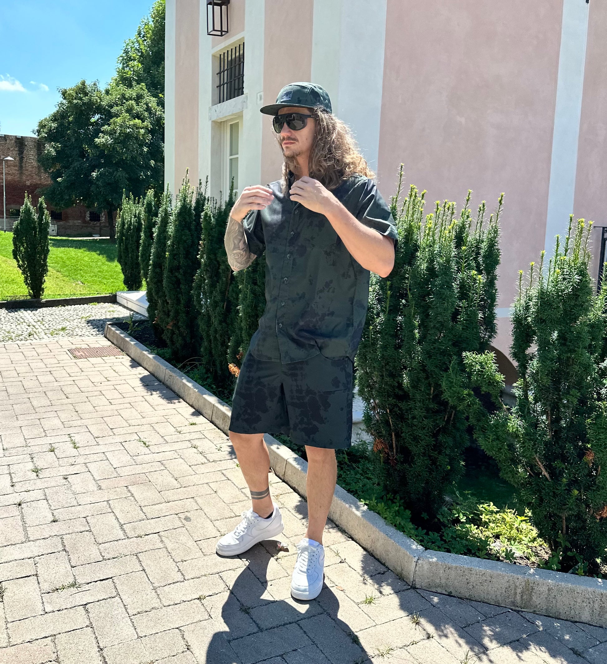 Fabric: 3oz 93% certified recycle polyester 7% spandex poplin weave - stretch, wicking and UV protection - digital print.