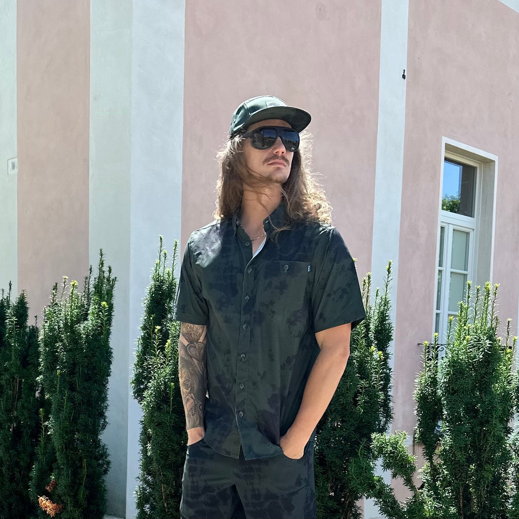 Casual fit, short sleeve button up shirt, button down collar with interior KAVU logo jacquard tape, contrast interior neck band and under placket piecing, single chest pocket with button closure, faux wood buttons, back yoke panel, curved hem.