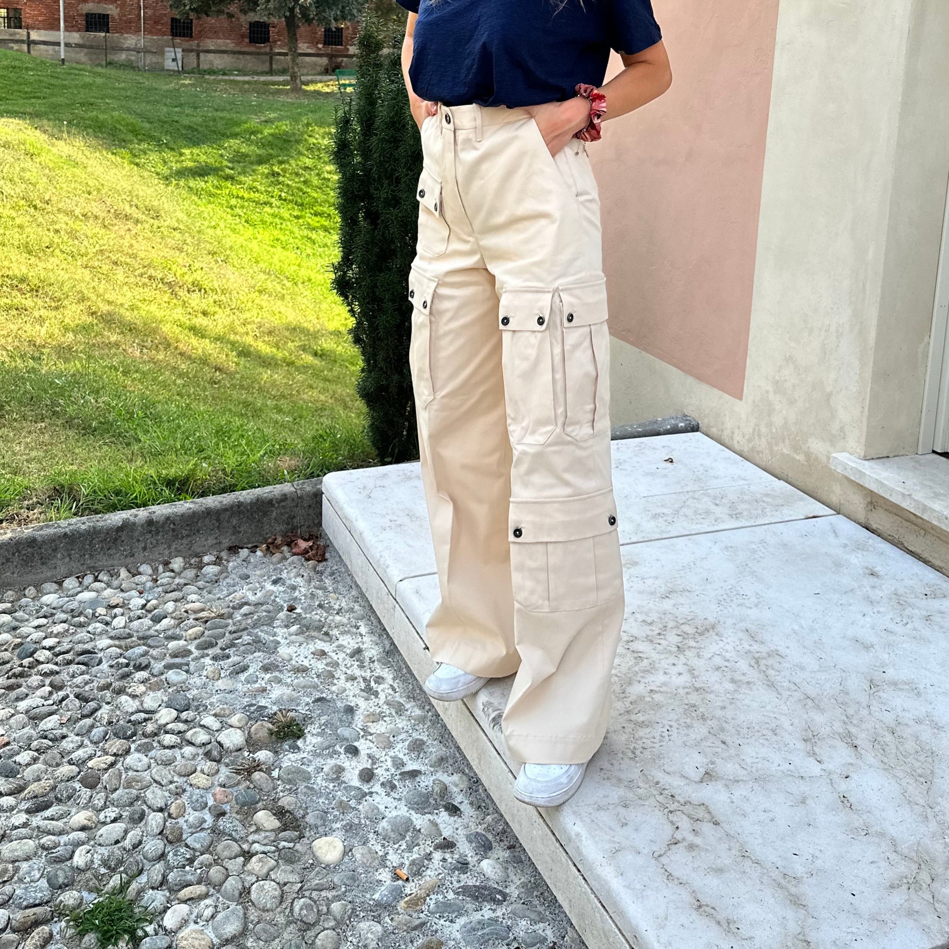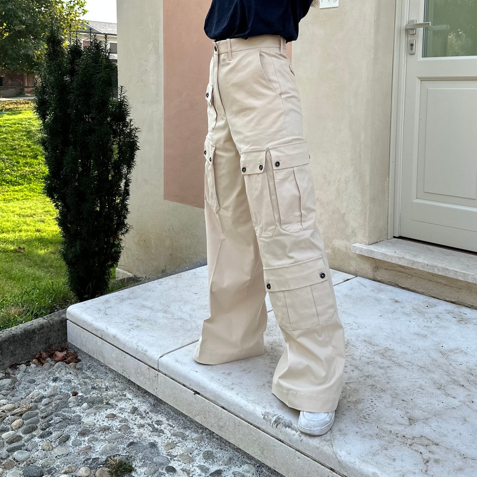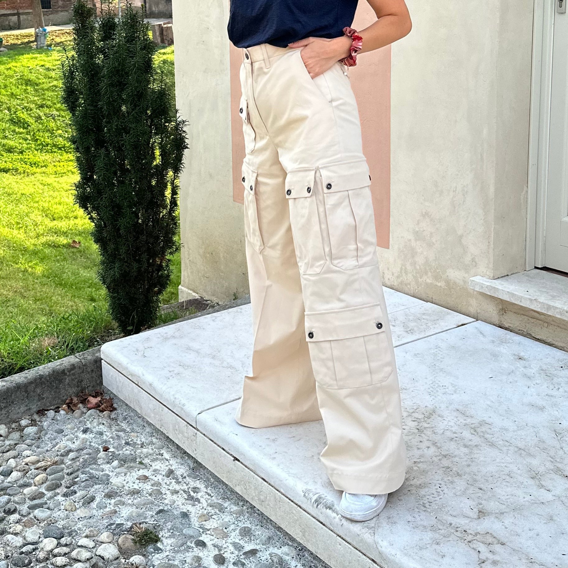 High waist with belt loops and front button and zip closure. Vertical pockets and flat pockets with flap and button on the front and large pocket typical of the cargo model. Welt pockets with flap and button on the back.