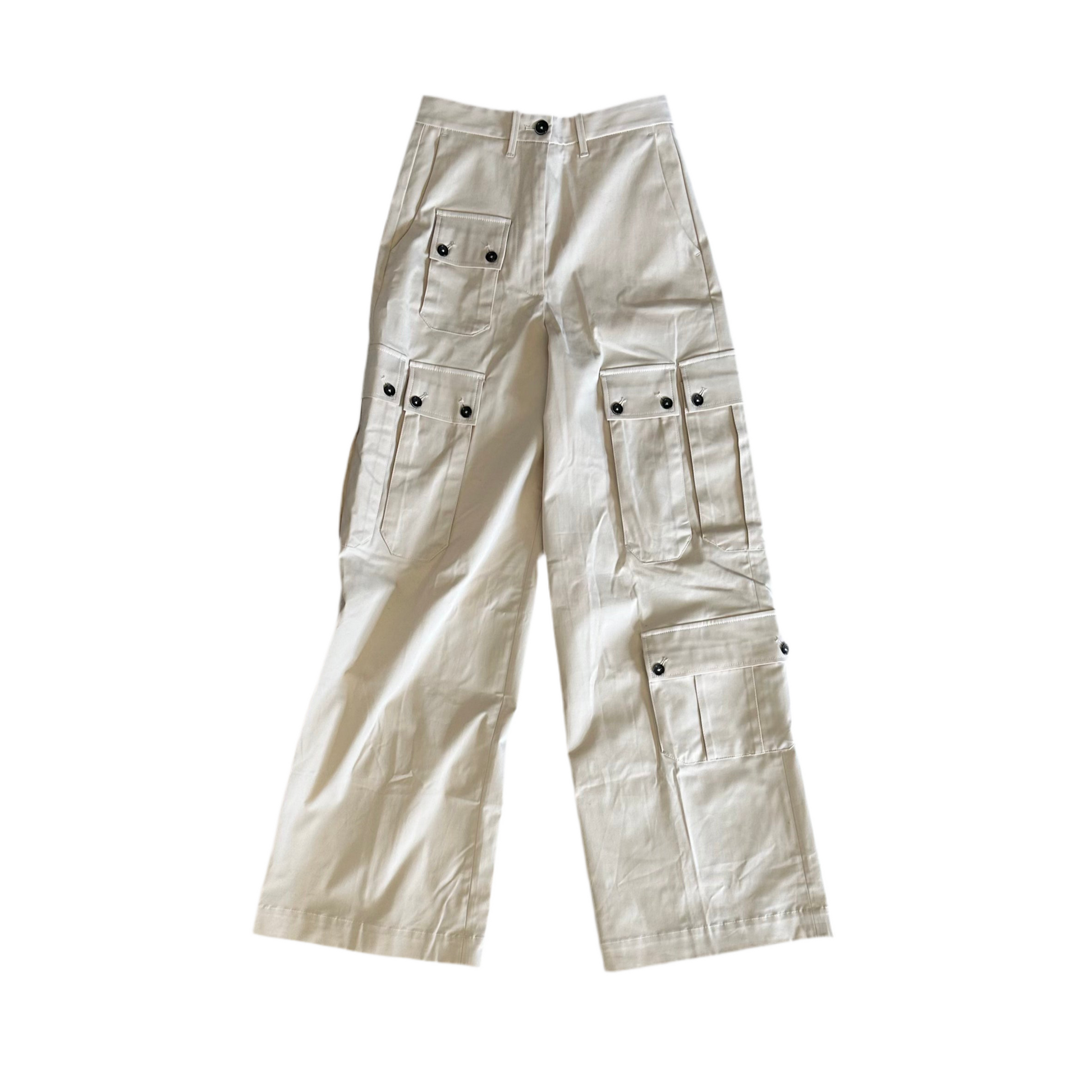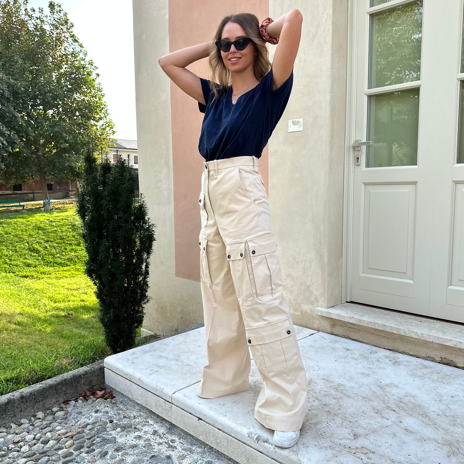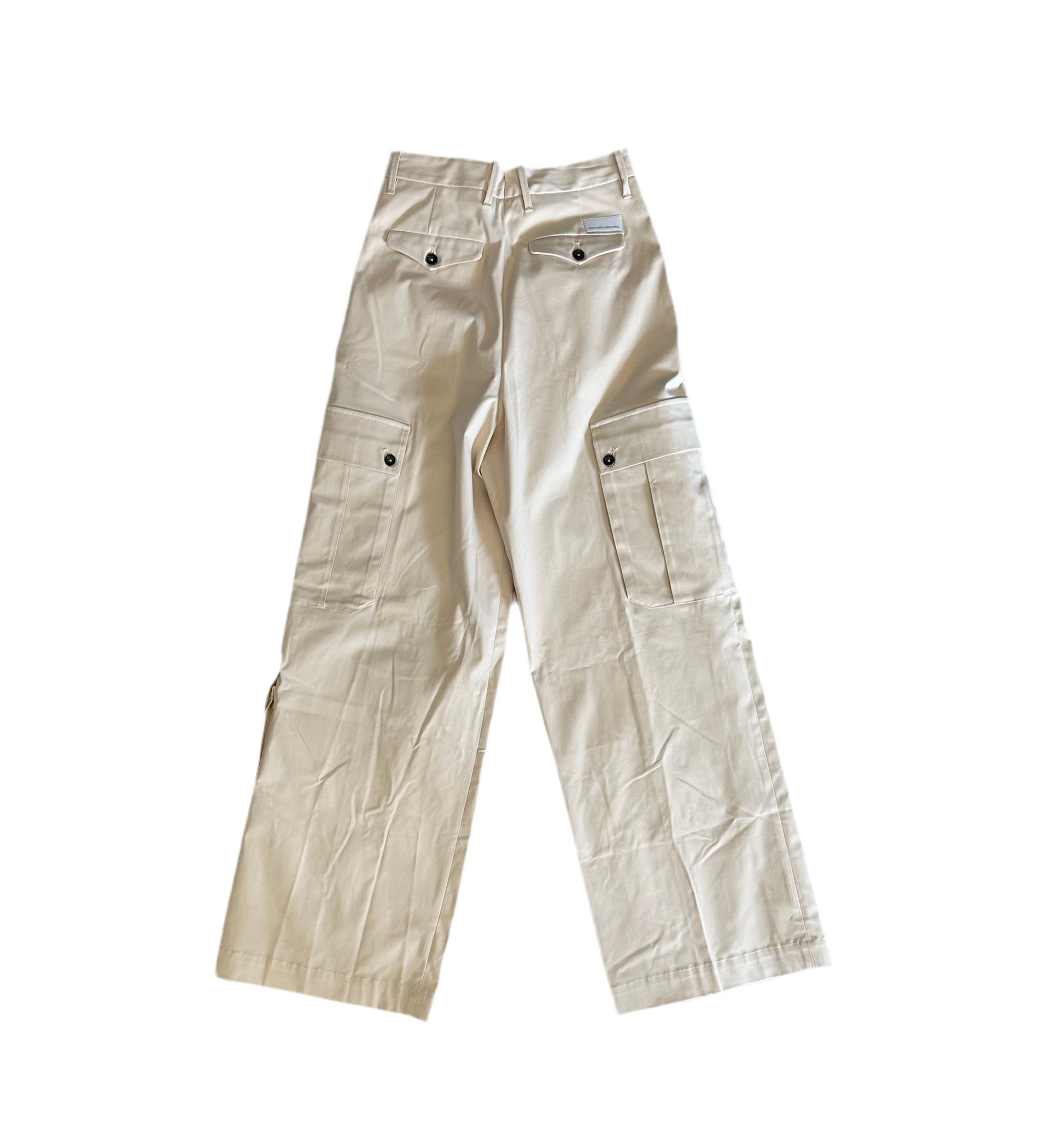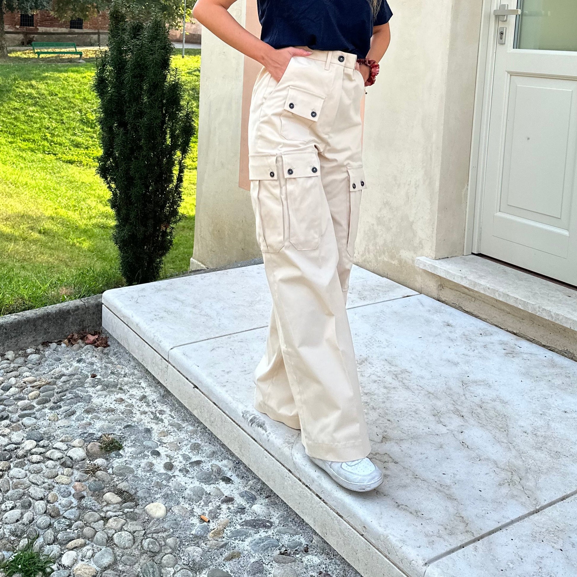 High waist with belt loops and front button and zip closure. Vertical pockets and flat pockets with flap and button on the front and large pocket typical of the cargo model. Welt pockets with flap and button on the back.