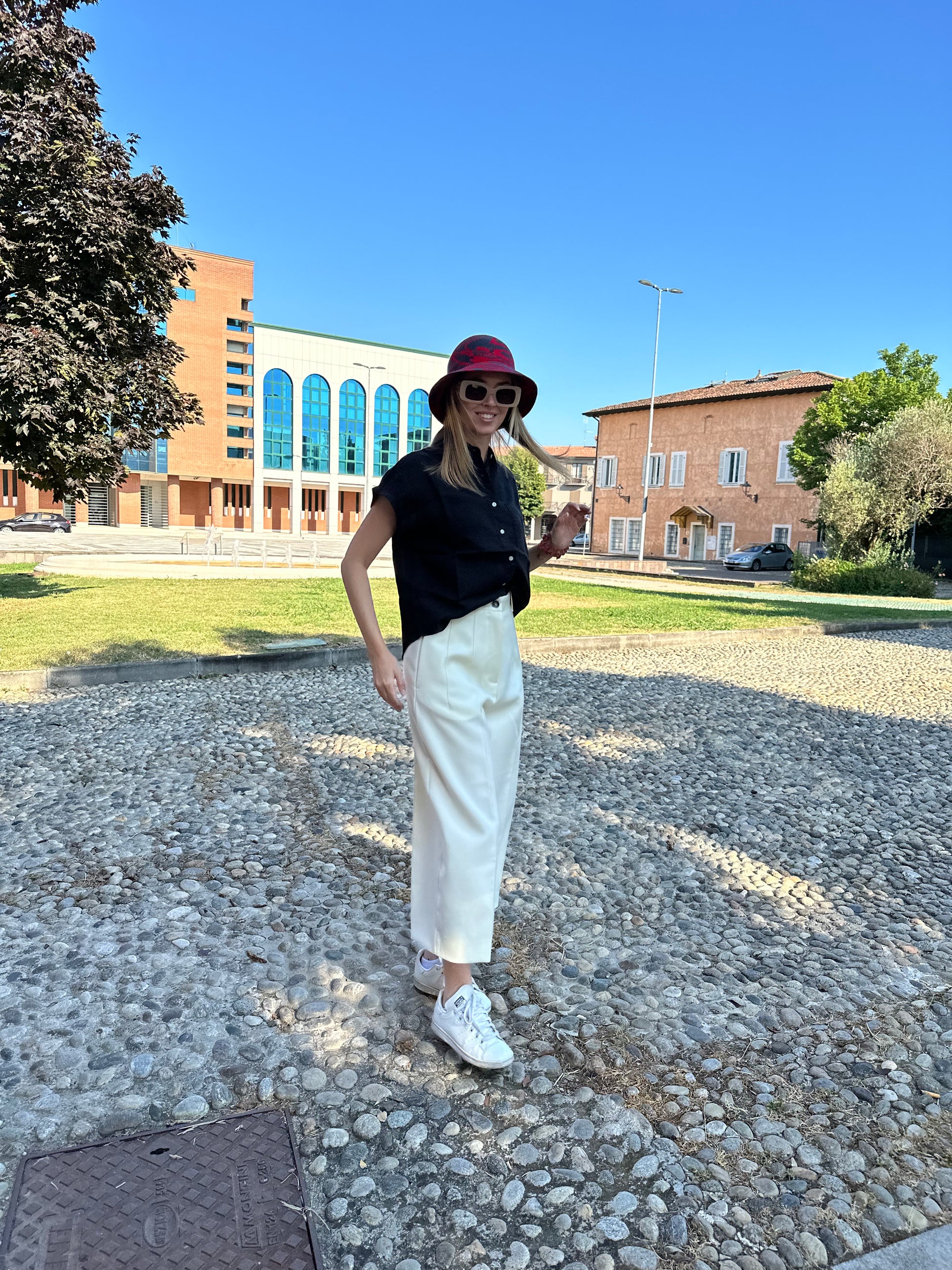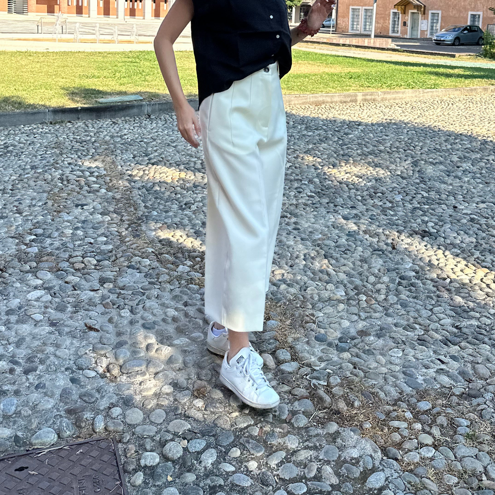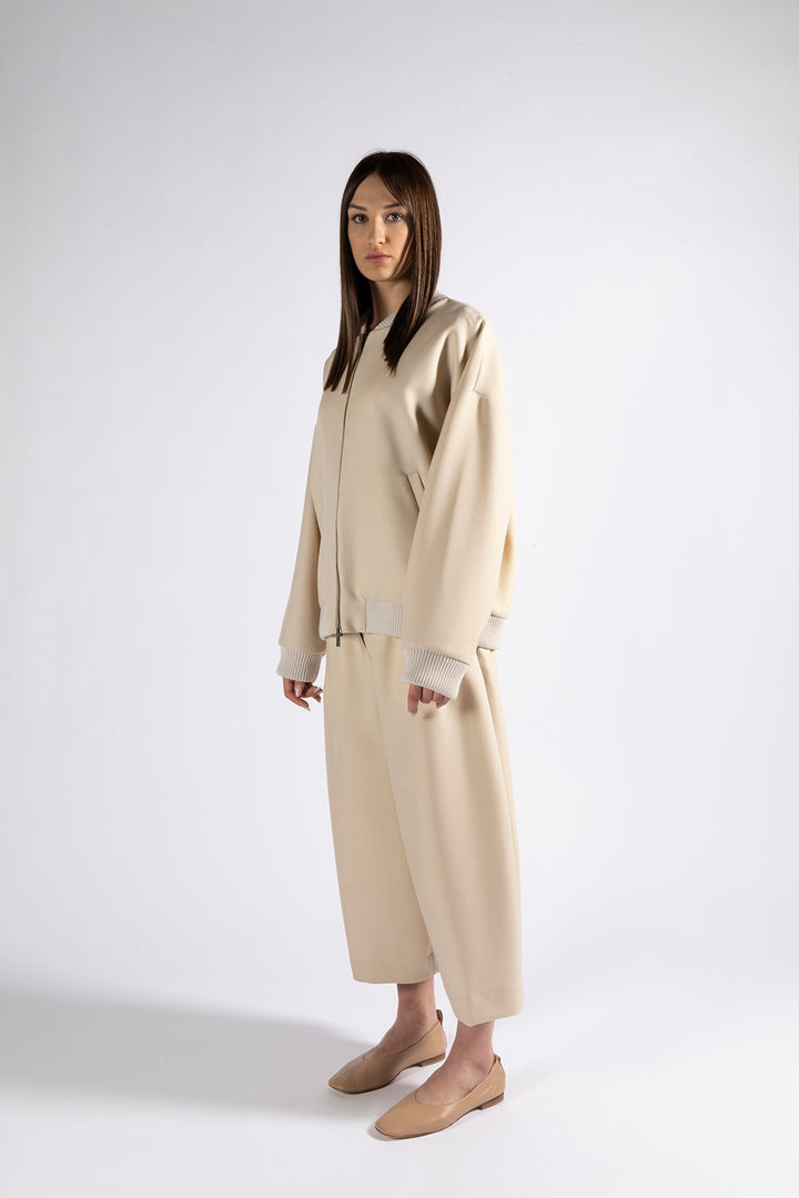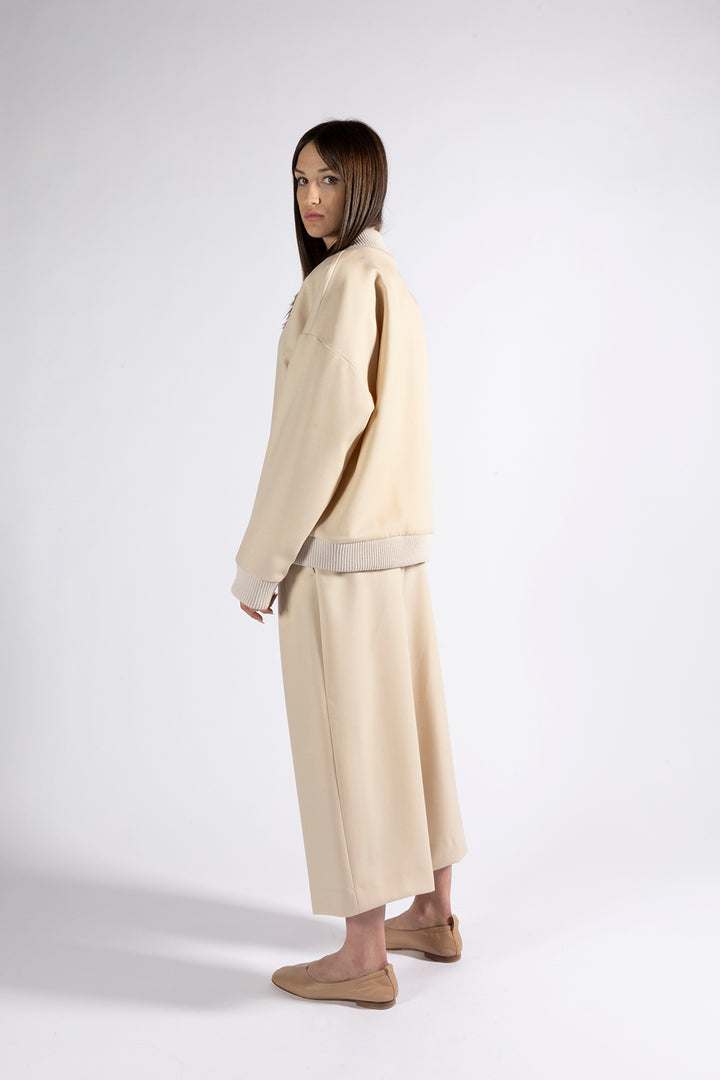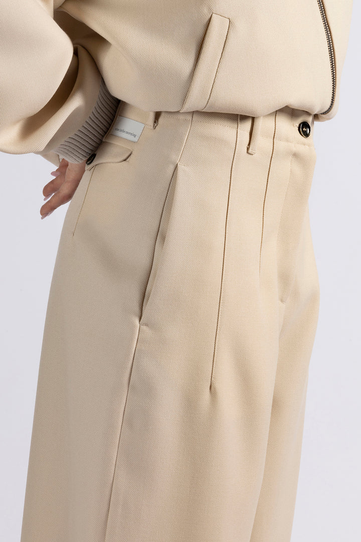 High-waisted trousers with wide and short legs; front pockets; back flap pockets; Central closure with zip and horn button.