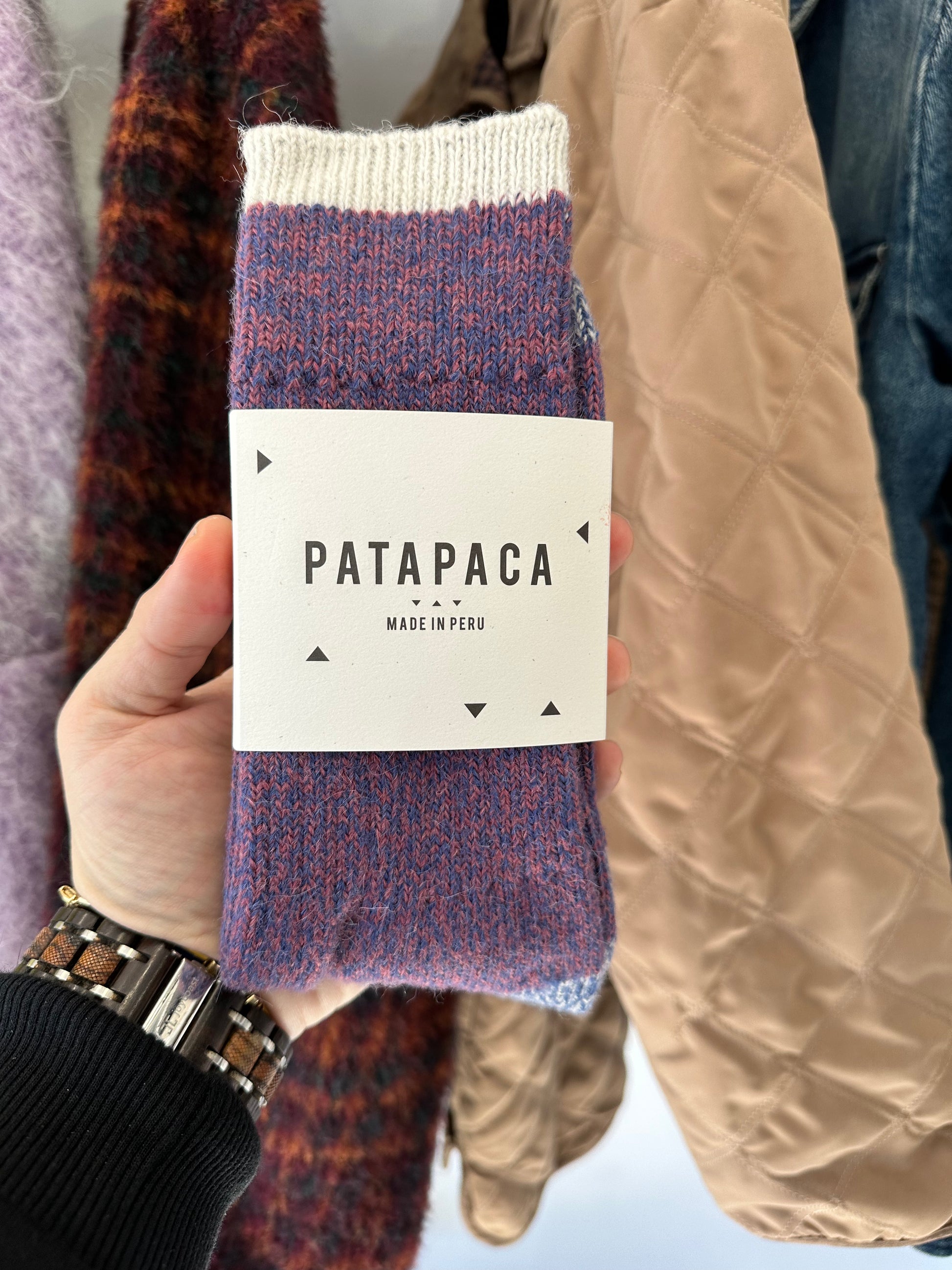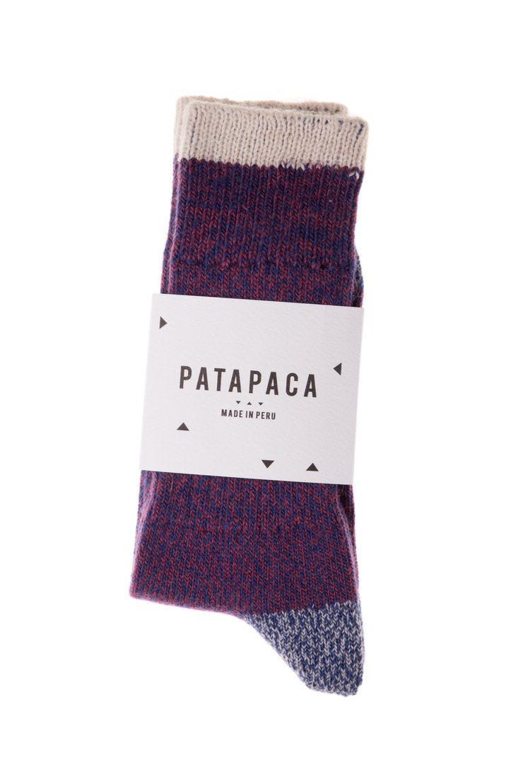 This pair of Pata Paca socks feature a melange yarn combination and contrast color on ankle and toe. Alpaca is a naturally luxurious fiber which is super soft as well as warm and hypo – allergenic. These are crafted with a special blend of fibers which also make the socks anti microbial. One size fits all